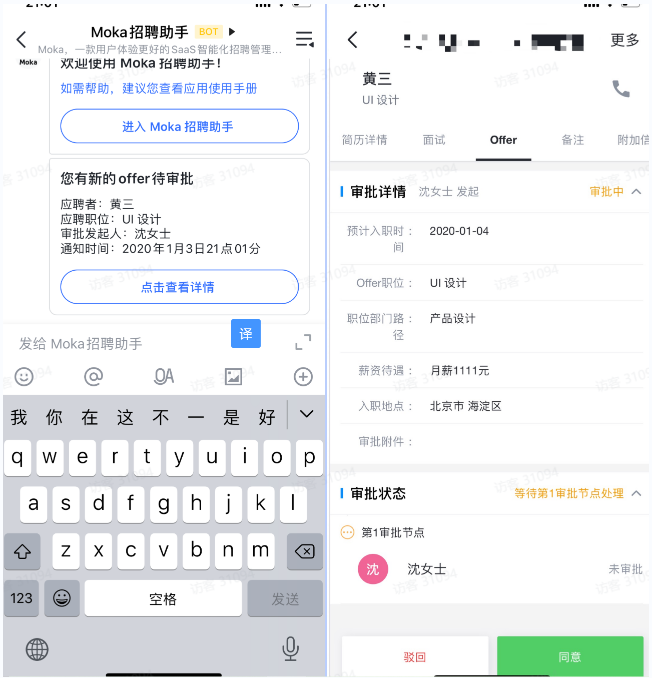 点击移动端底部Offer审批,可查看待审批和已审批的Offer;进入待审批Offer,可驳回/同意Offer。