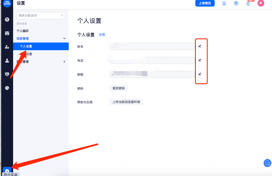 ①个人设置:点击设置-信息管理-个人设置,您可以在这里修改您的个人信息。