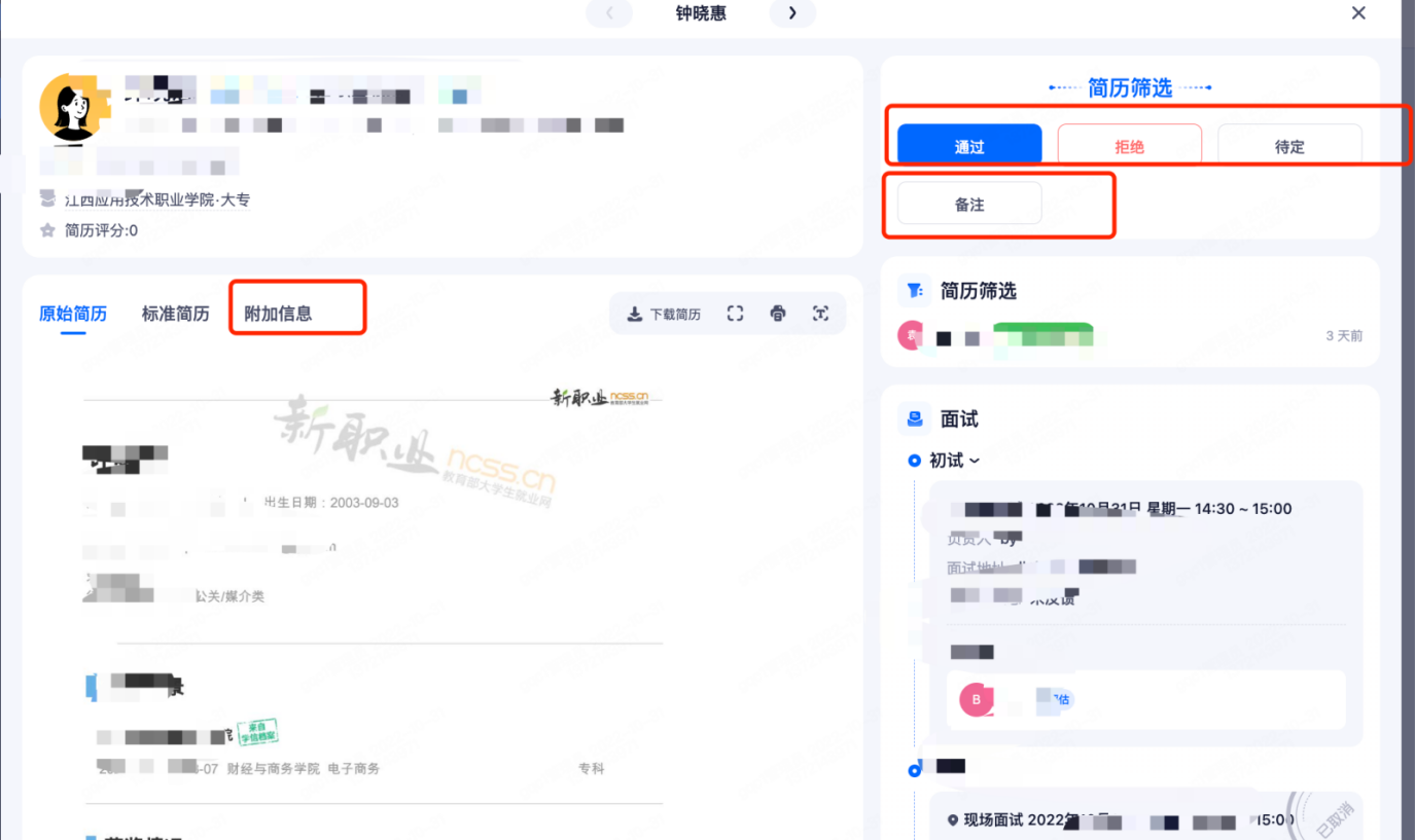 收到消息提醒后,您可直接点击查看简历详情,或登录Moka招聘系统进行操作。筛选简历时您可以在“备注”中@某人向某人传达信息;在附加信息中可查看其他附件。