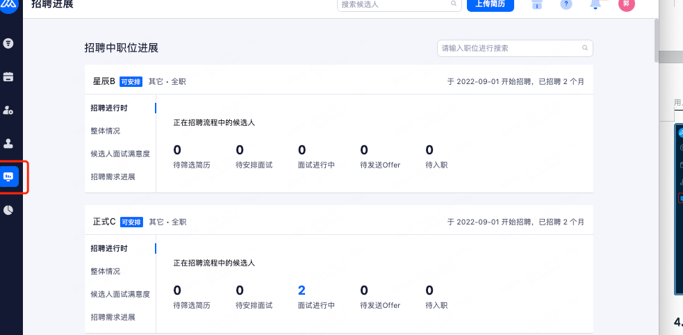 您可以在此页面查看您负责的招聘中职位的候选人状况和招聘累计概况。每个统计数字都可以点进去查看所对应的候选人详情。