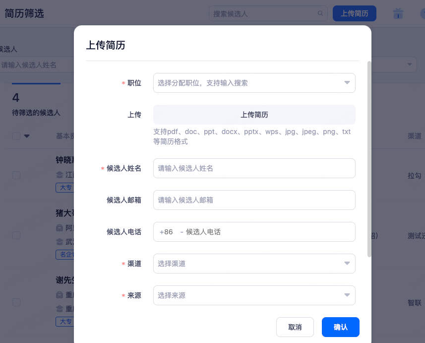 推荐用人部门筛选:通过 HR 筛选的简历,可推荐给面试官再次筛选,如果面试官反馈“同意面试”,HR 将收到简历筛选通过的通知,可为候选人安排面试。