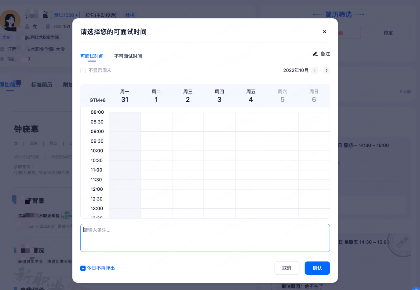 若简历通过,点击“通过”进入面试环节,您需要选择可面试时间,也可以备注信息,便于HR合理安排面试。