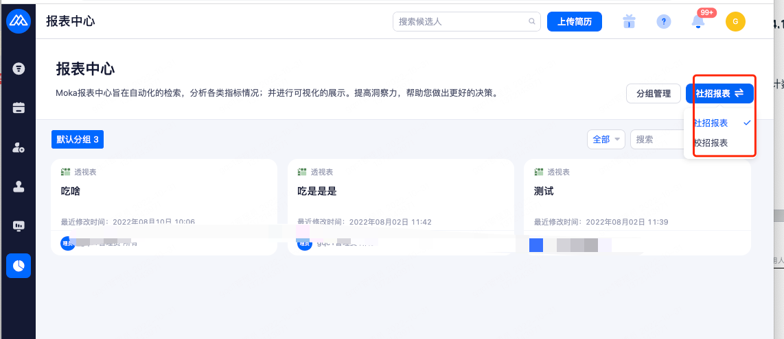 您登录Moka系统后会默认进入简历筛选页面,您可以通过左侧导航栏和顶部菜单栏进入不同的功能页面。