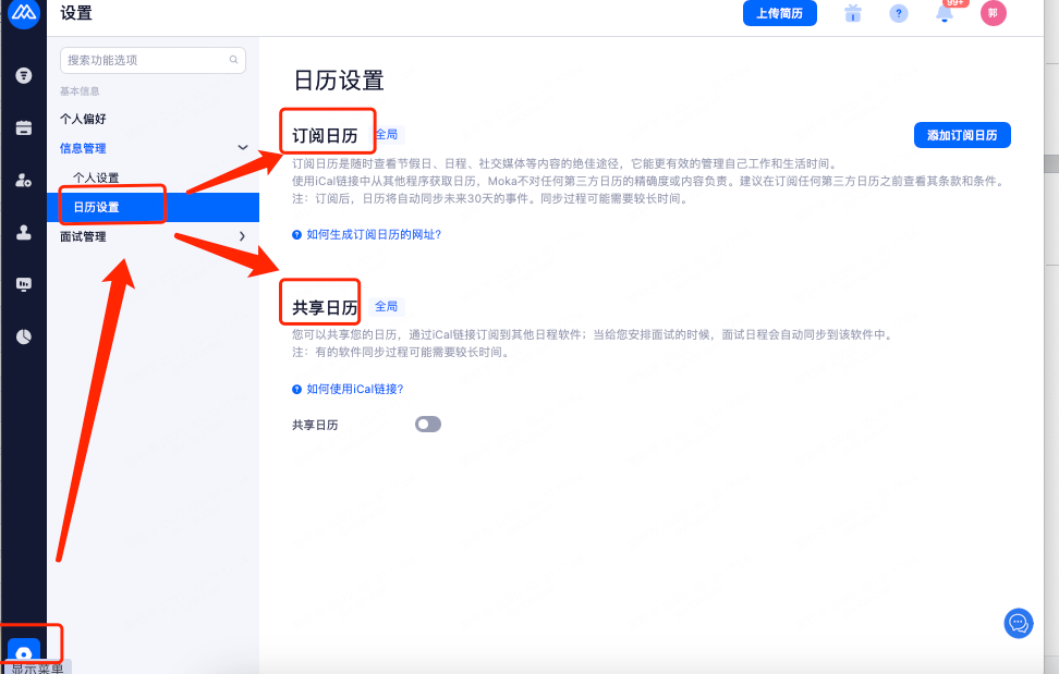 •通过订阅日历您可以将您自己的日历反向同步至Moka系统中https://mokahr.udesk.cn/hc/articles/87101;