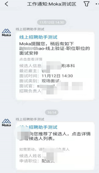 HR推荐候选人给用人部门后,面试官(用人经理)会在Moka系统里收到提醒;您绑定了Moka账号的客户端(钉钉、微信等)也能收到消息提醒。消息提醒中包括:候选人姓名、职位及HR信息。