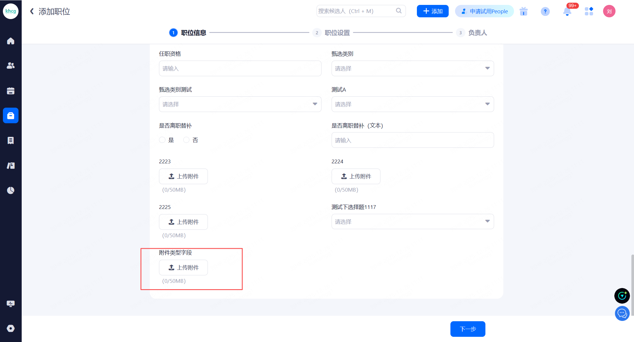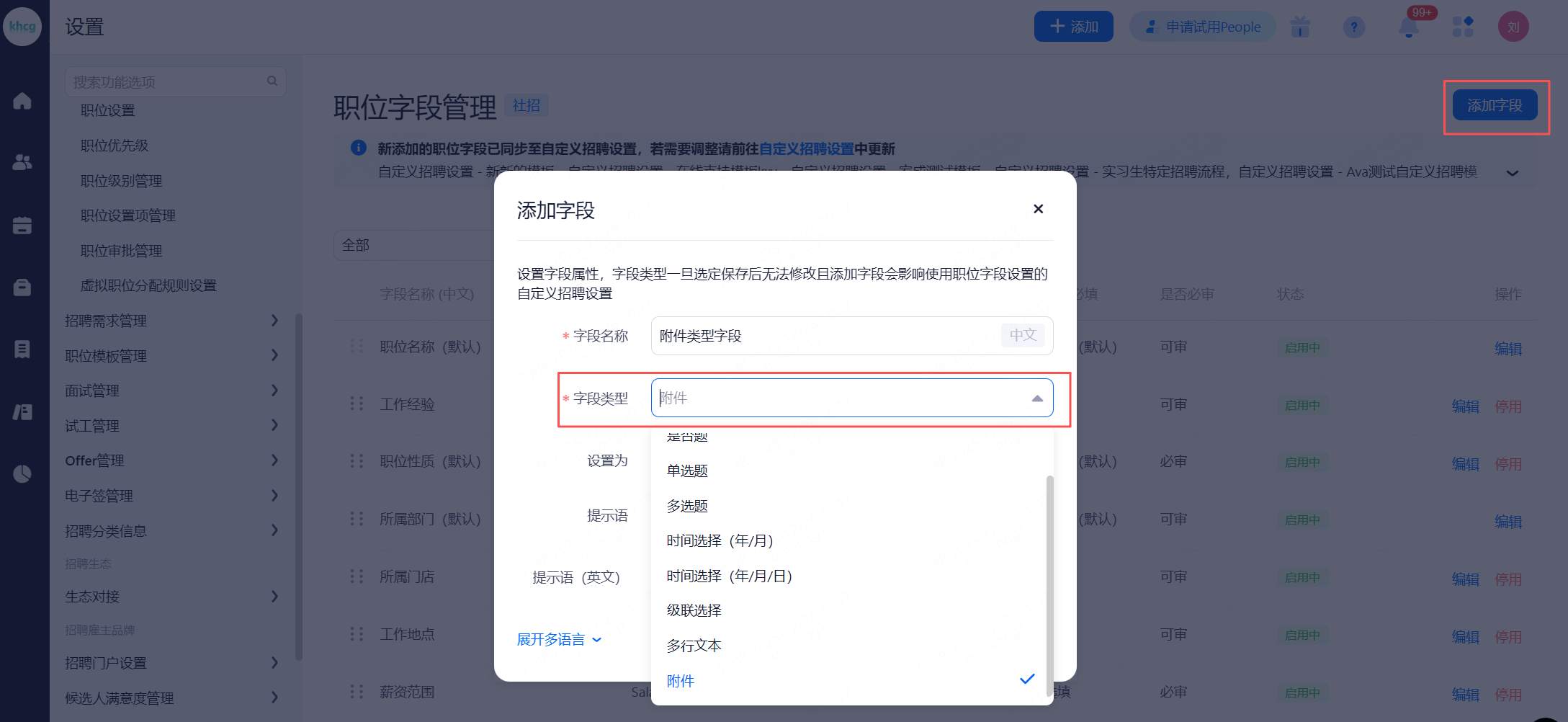 创建/修改职位自定义字段时,字段类型支持附件类型(社招/校招/内推/猎头配置页面的职位信息不可显示附件类型字段),附件大小上限为50M
