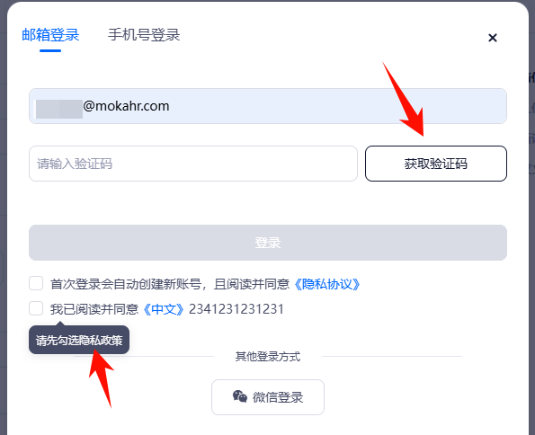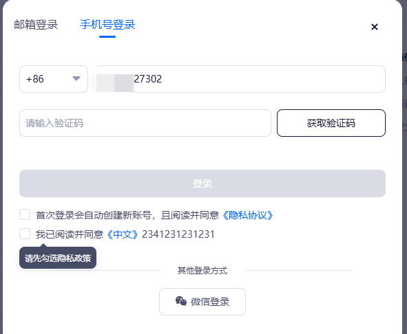 之前在点击登录时才会校验是否勾选隐私政策,调整为点击获取验证码时就会校验是否勾选隐私政策: