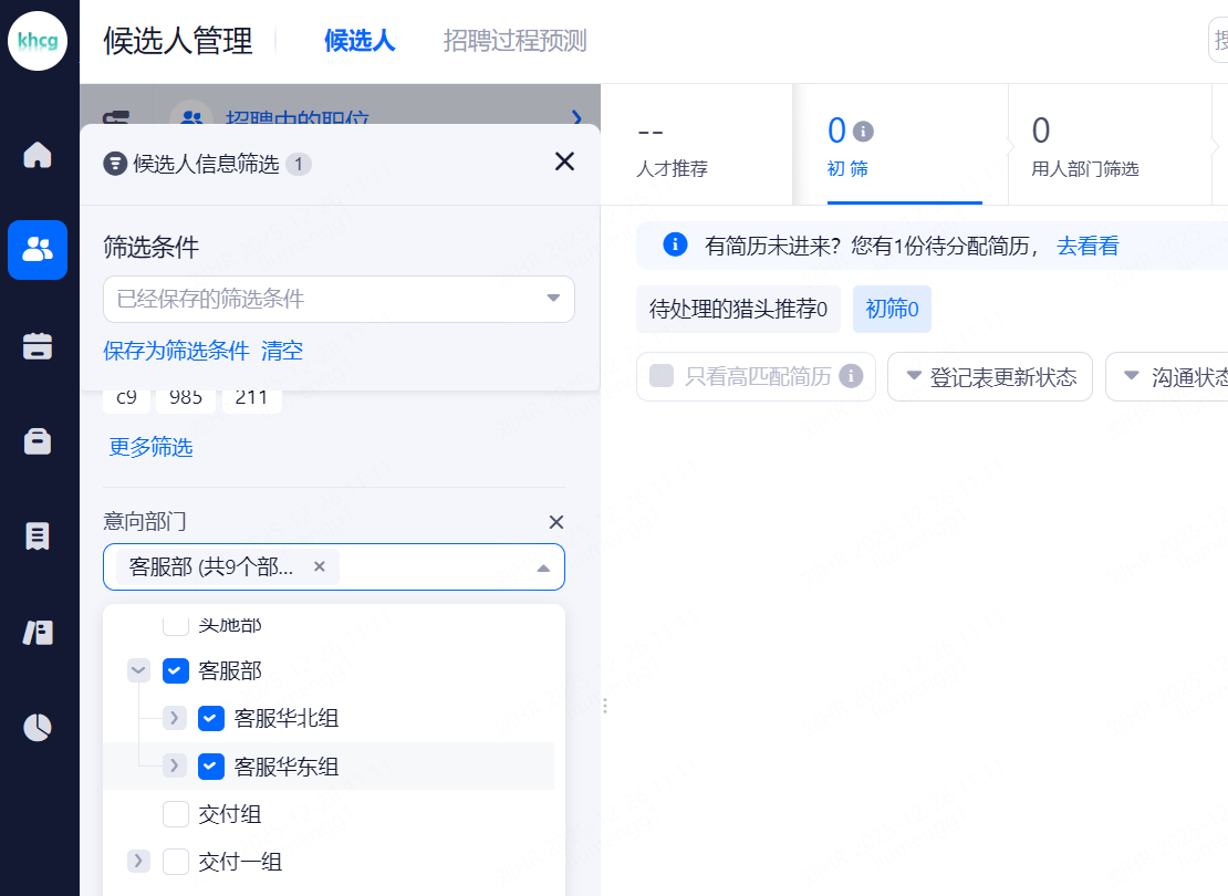 PS:多选表示筛选出多个意向部门下投递的候选人,不表示候选人投递多个意向部门。