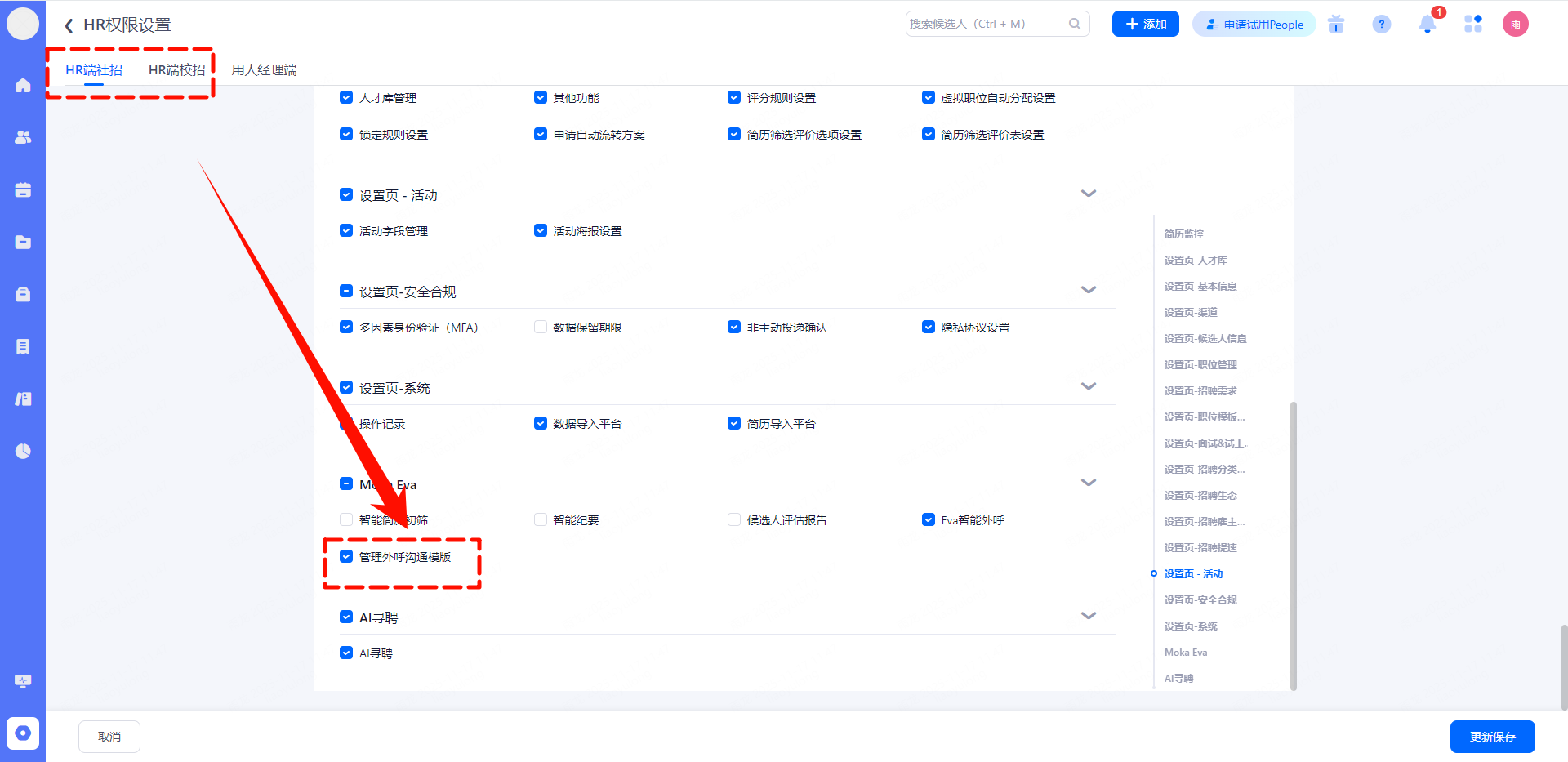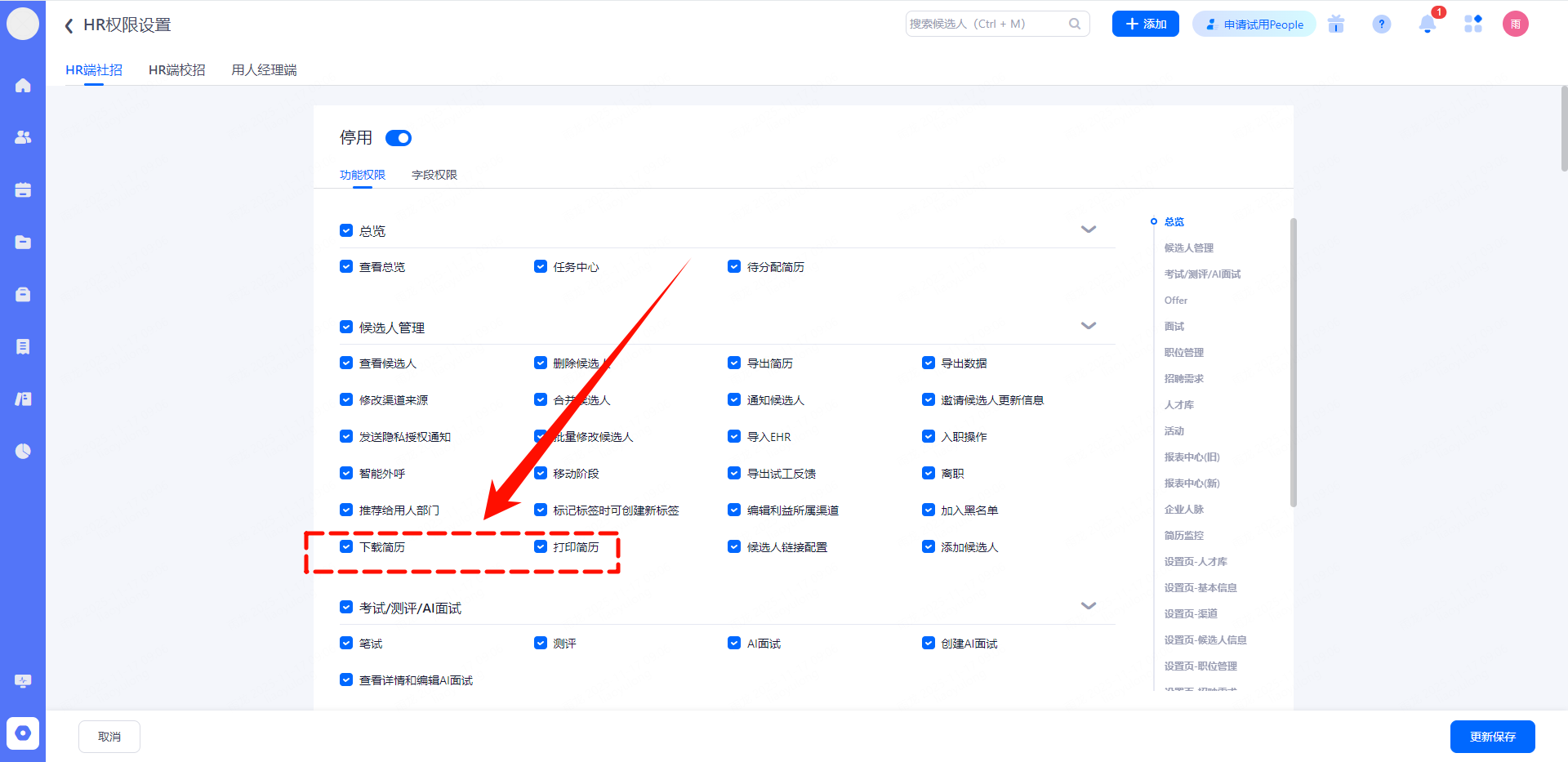 角色管理可设置HR端的下载/打印简历的权限,目前可以对社校招模块分别管控下载/打印简历的权限(用人经理端并未做拆分):