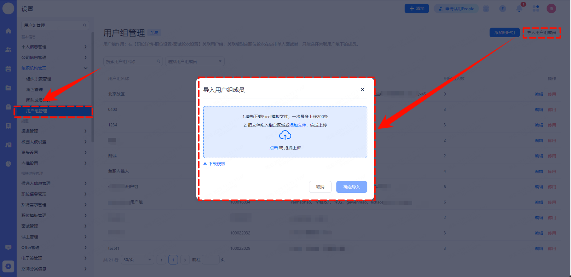 用户组页面新增【导入用户组成员】按钮,点击按钮后,打开批量导入弹窗: