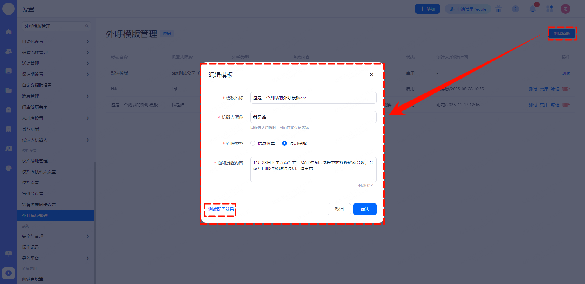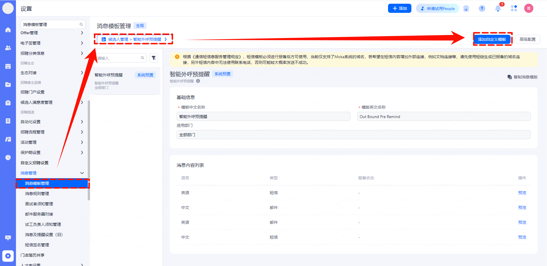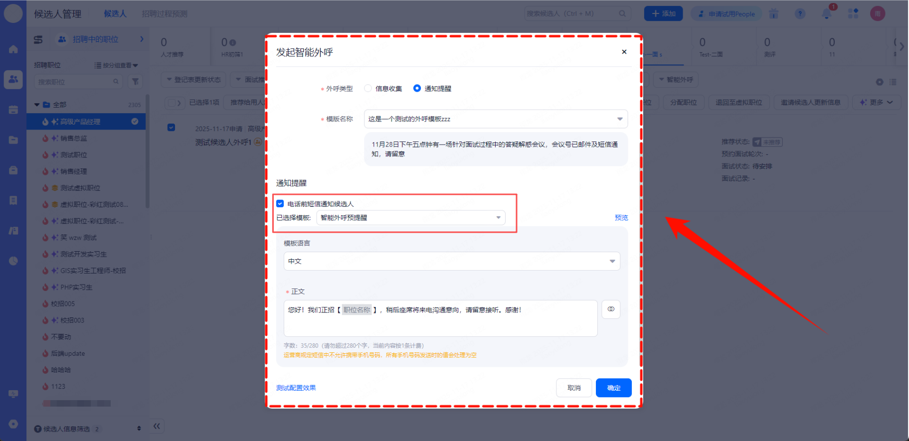 设置智能外呼预提醒消息模板:进行外呼通知时勾选”电话前短信通知候选人“: