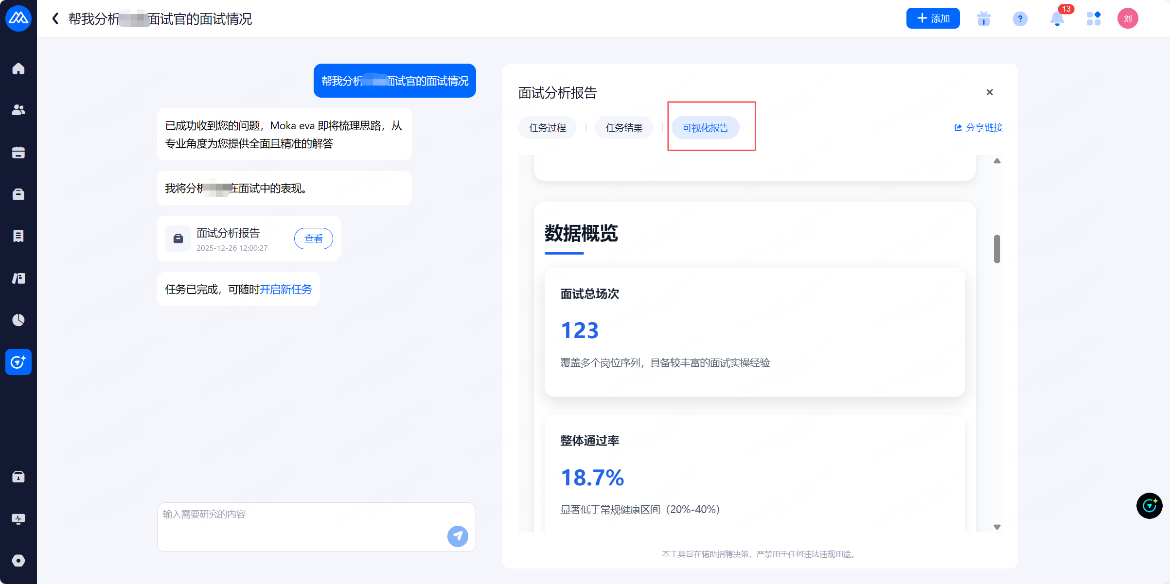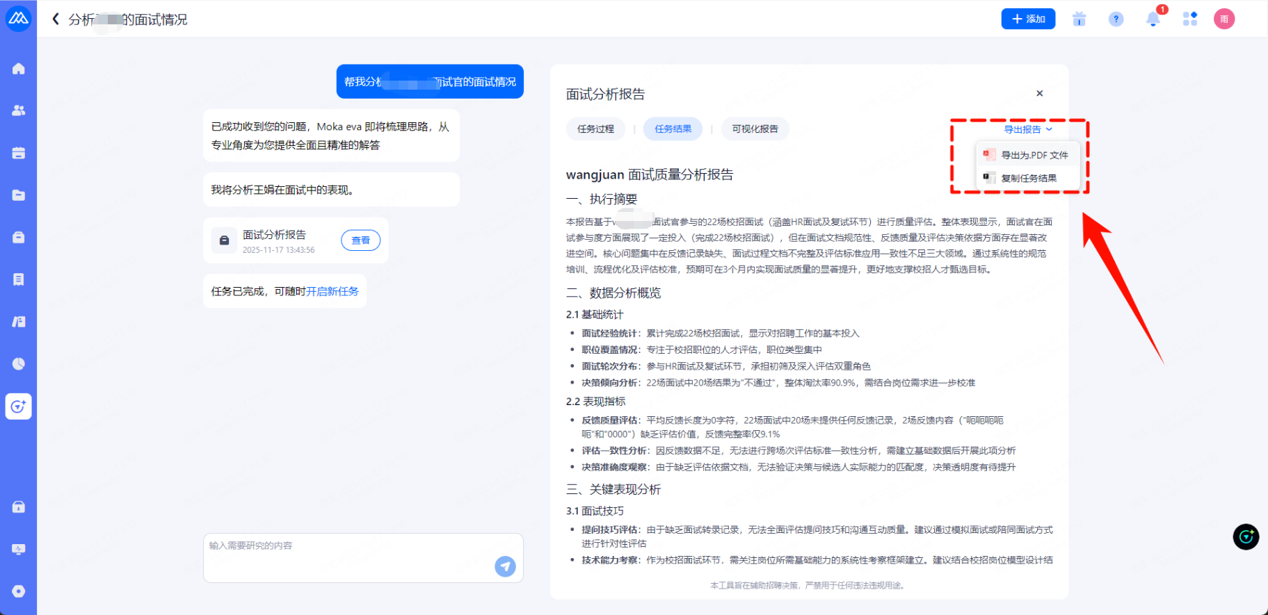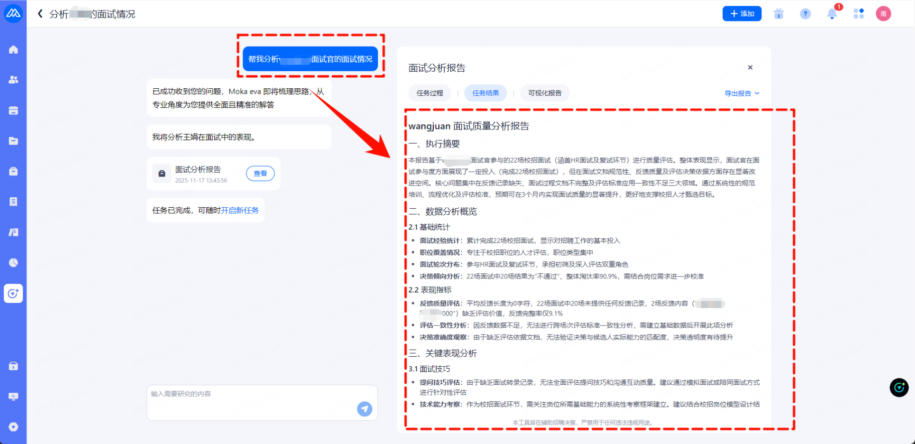 直接输入“分析xx面试官的面试情况”,即可生成面试官分析报告。分析维度包括:面试反馈质量、面试技巧、评估准确性、沟通表现等。