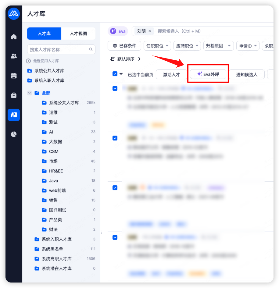 人才库 | 人才库列表 → 选择候选人 → Eva 外呼 |