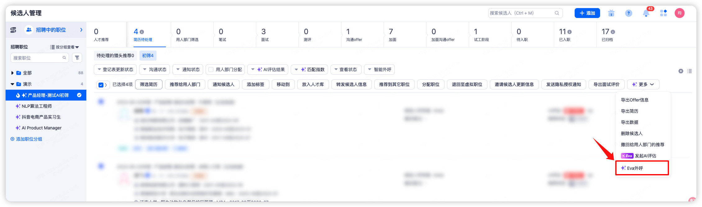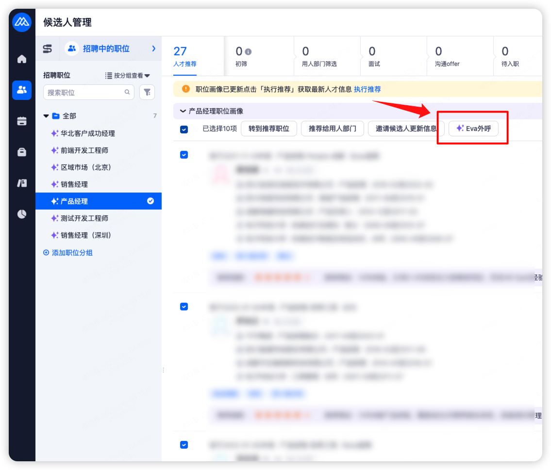 人才推荐 | 人才推荐页 → 选择候选人 → Eva 外呼 |