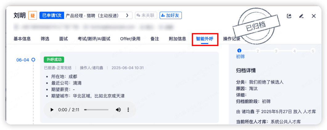 数据沉淀 | 自动提取如求职意向、薪资期望等信息,生成可检索报告 |