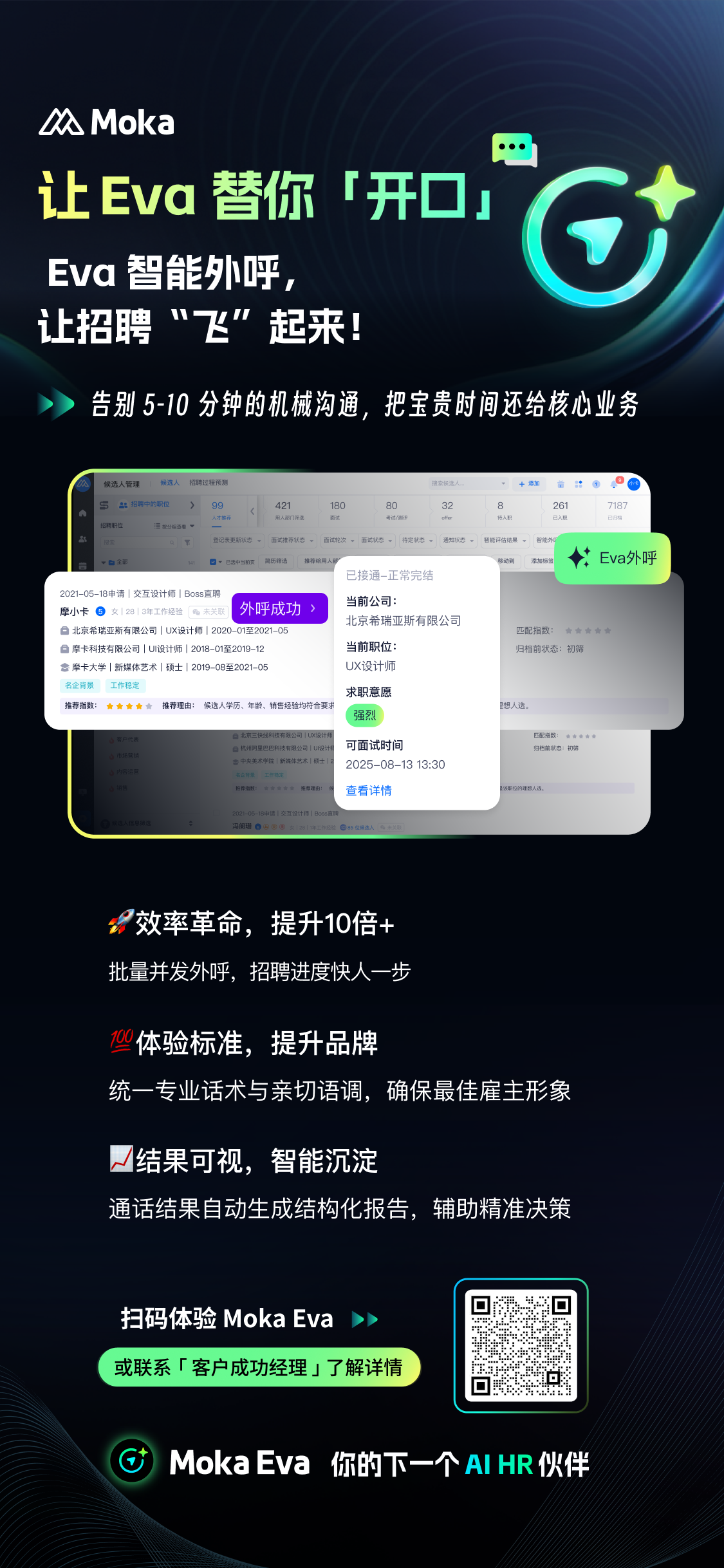 Eva 智能外呼模拟真人语音与候选人进行自然对话,批量完成重复外呼,并输出结构化结果报告,全面提升招聘效率与候选人体验。